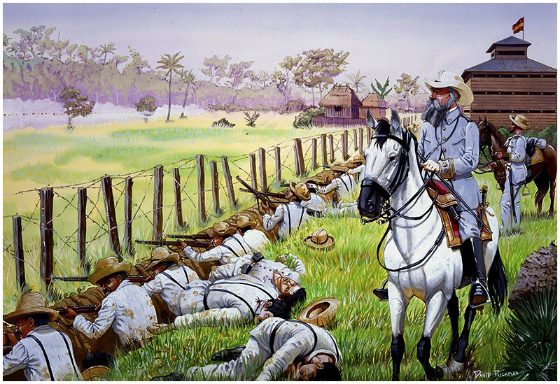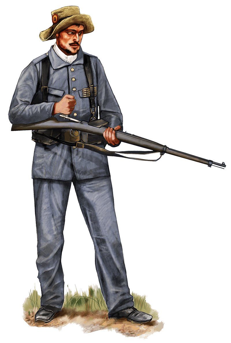 Un soldado bien equipado, vestido con túnica de patrón guayabera y pantalón de rayadillo. Su sombrero de paja de jipijapa es estándar para los trópicos. Está armado con un rifle Mauser modelo 1893.