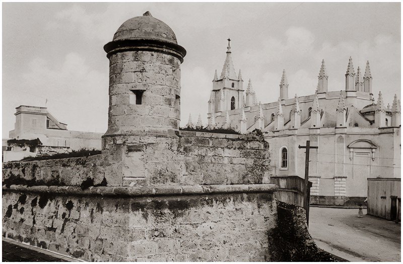 Torreón de defensa de la vieja Muralla de La Habana, con la iglesia del Ángel al fondo.