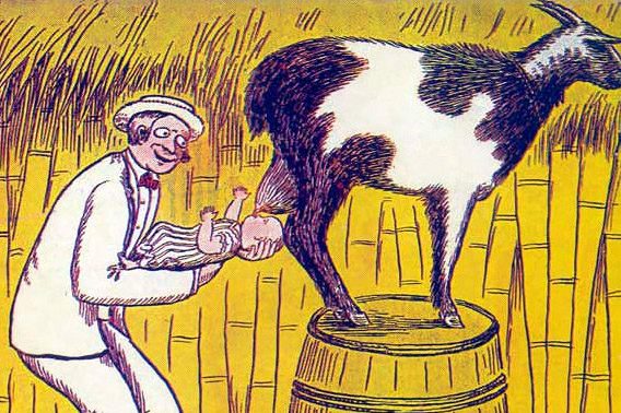 Caricatura de la antigua costumbre de alimentar a los niños con leche de chivas.