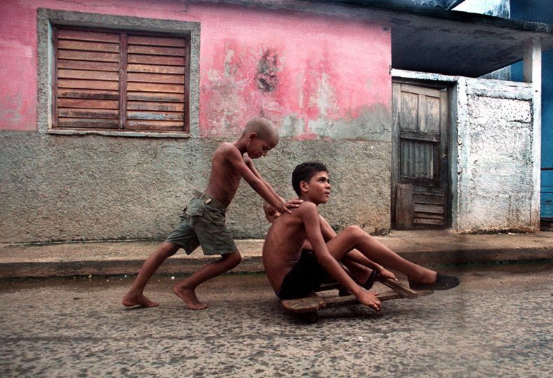 Niños jugando con una carriola en las calles de la ciudad de Matanzas.