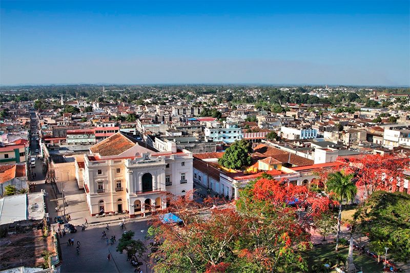Vista aérea de la ciudad de Santa Clara, fundada en 1689 por varias familias a las que se les recuerda en un monumento formado por columnas situado en la plaza de la Iglesia del Carmen.