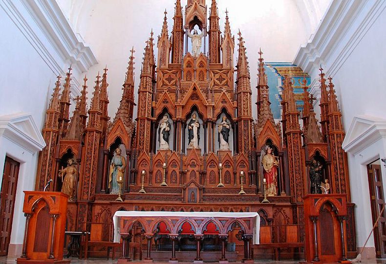 Altar mayor de la Iglesia Mayor de Trinidad. De estilo neogótico, está realizado con maderas preciosas del país, y su construcción corrió a cargo del sacerdote Amadeo Fiojere, y el carpintero Silverio Marín.