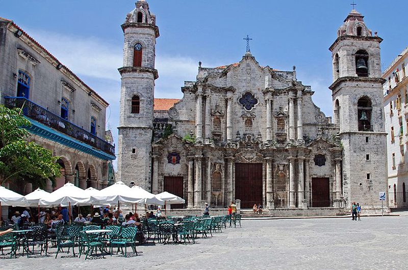 Iglesia Catedral de La Habana, un edificio de estilo barroco, con sus dos torres campanarios laterales, y su templo rectangular con tres naves y ocho capillas laterales.