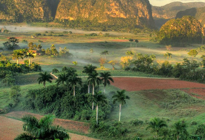El Valle de Viñales, con sus antiguas casas de tabaco, sus mogotes y sus palmeras reales.
